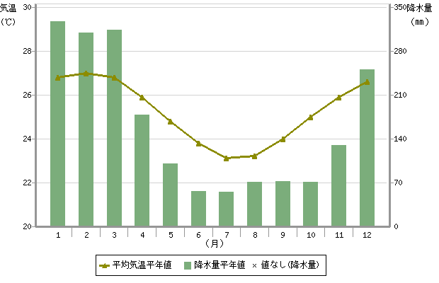 気候:年間平均気温23度、最高月平均気温27度。